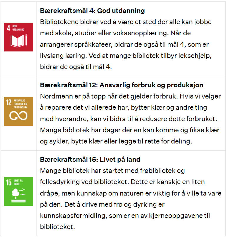 Bærekraft ligger i biblioteket sitt DNA. Biblioteka er verdas eldste delingskultur, og ein institusjon som skaper miljømessige og sosiale verdiar. Nokre eksempel på korleis biblioteka er med på å nå måla ser du døme på her: